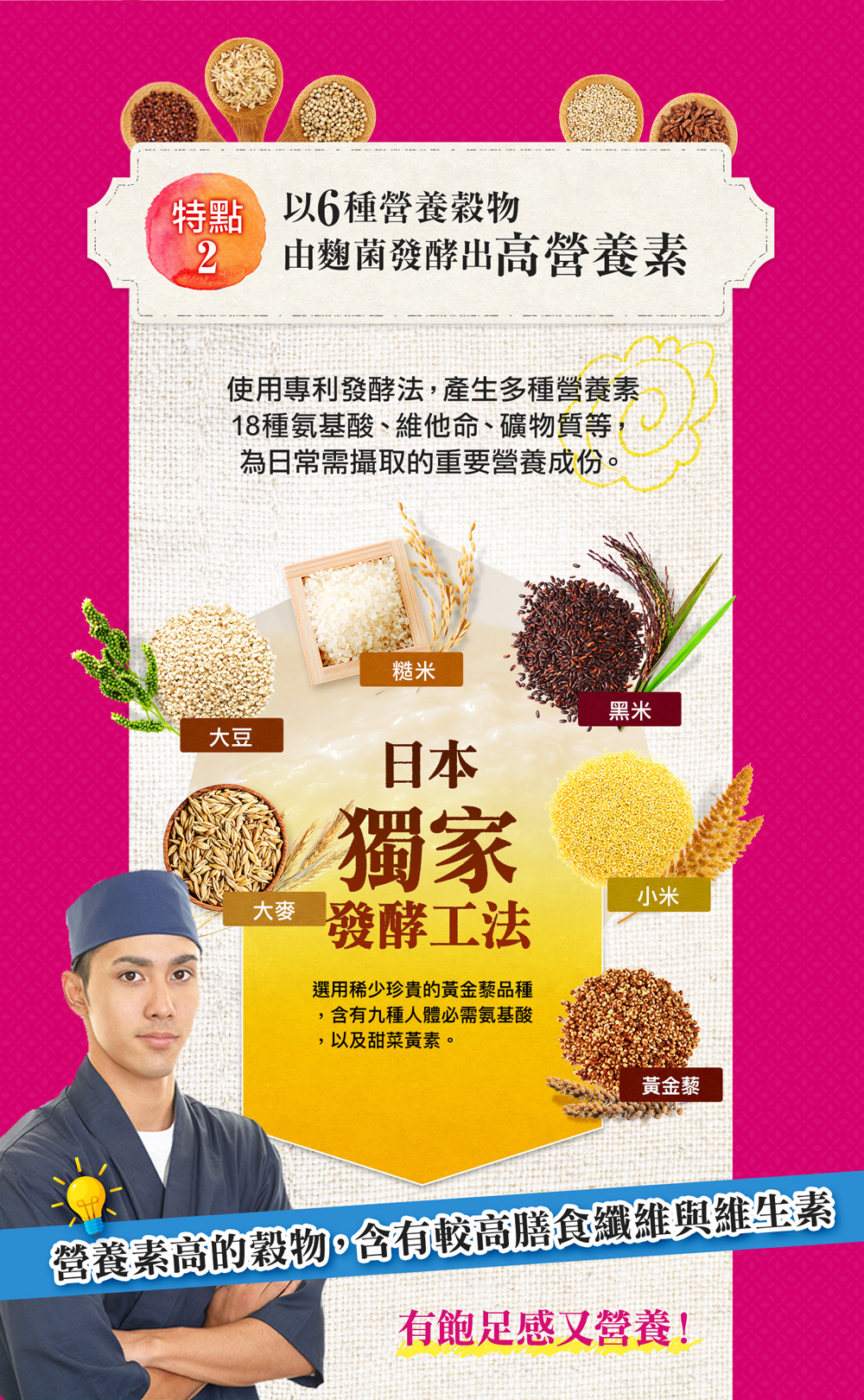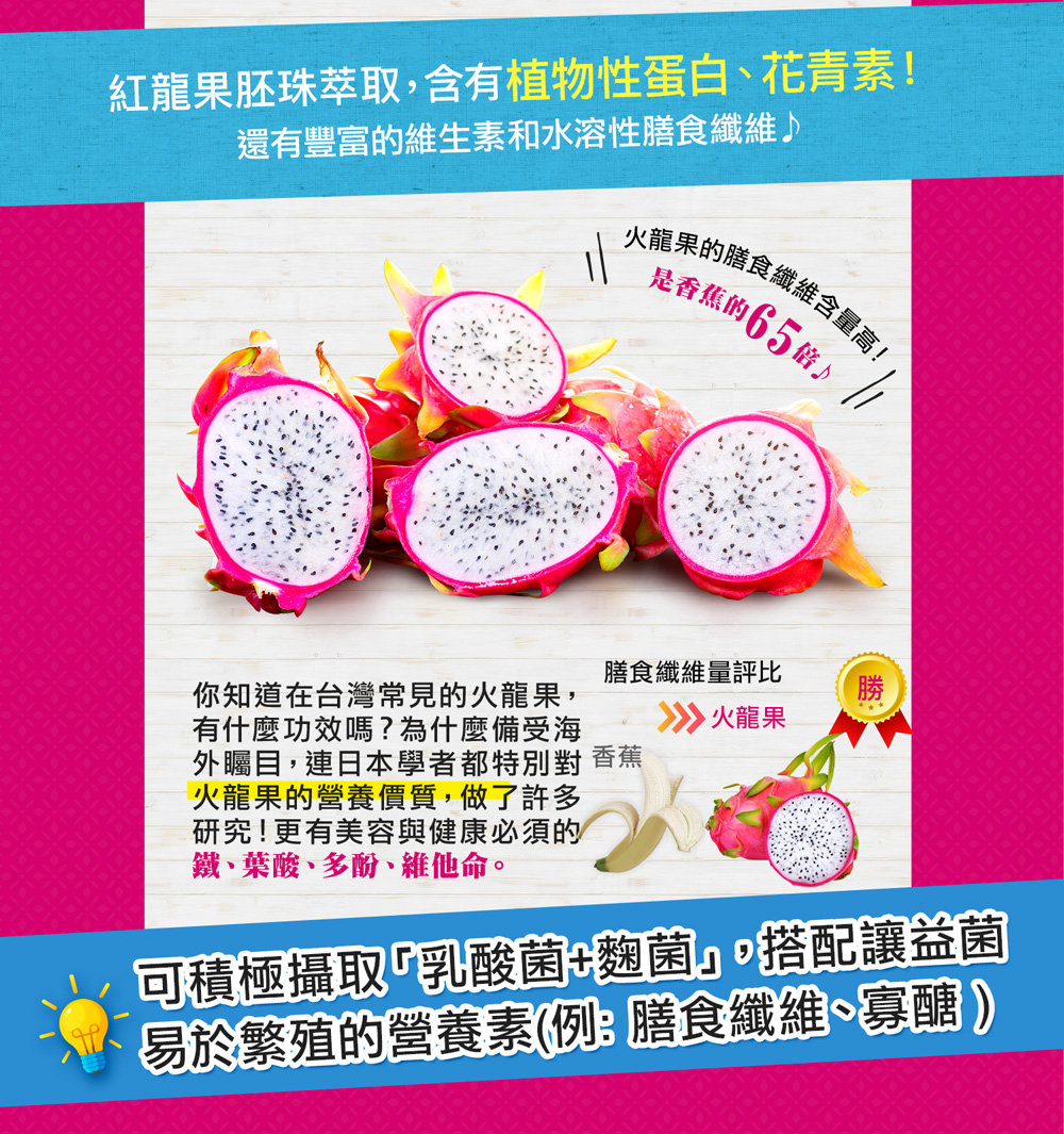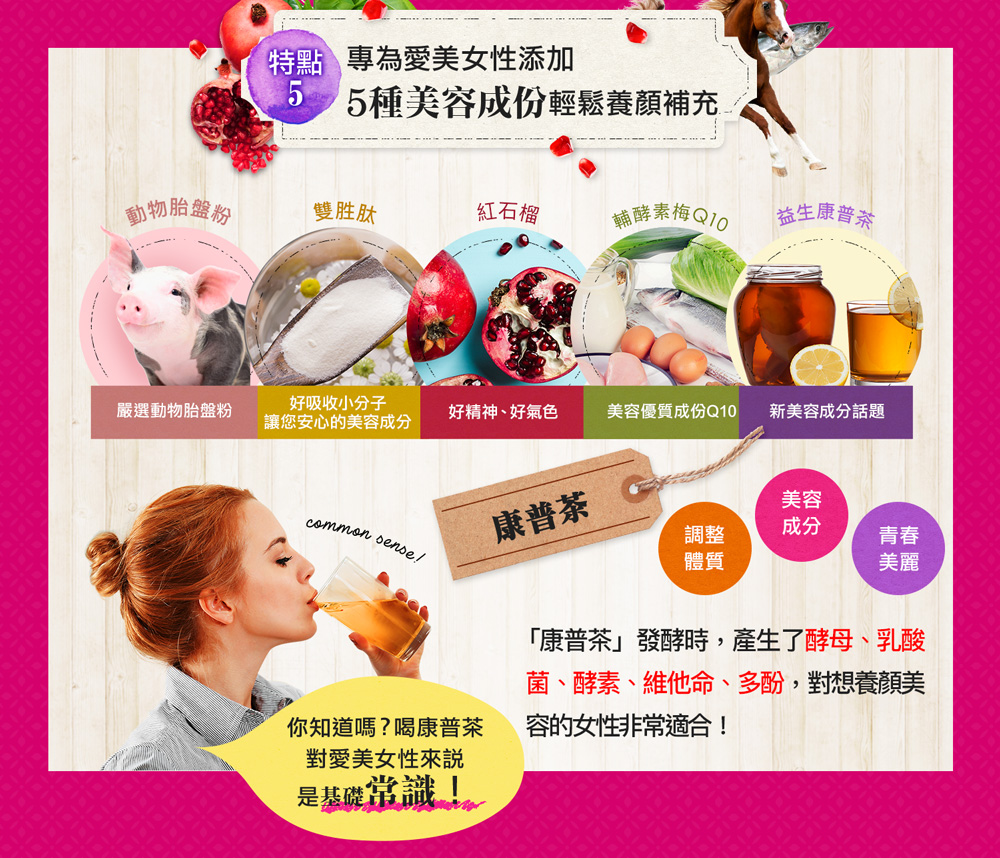 - 乳酸菌・COMBUCHA等,含有最適合亞洲人體質的麴菌,能幫助我們清潔腸道。