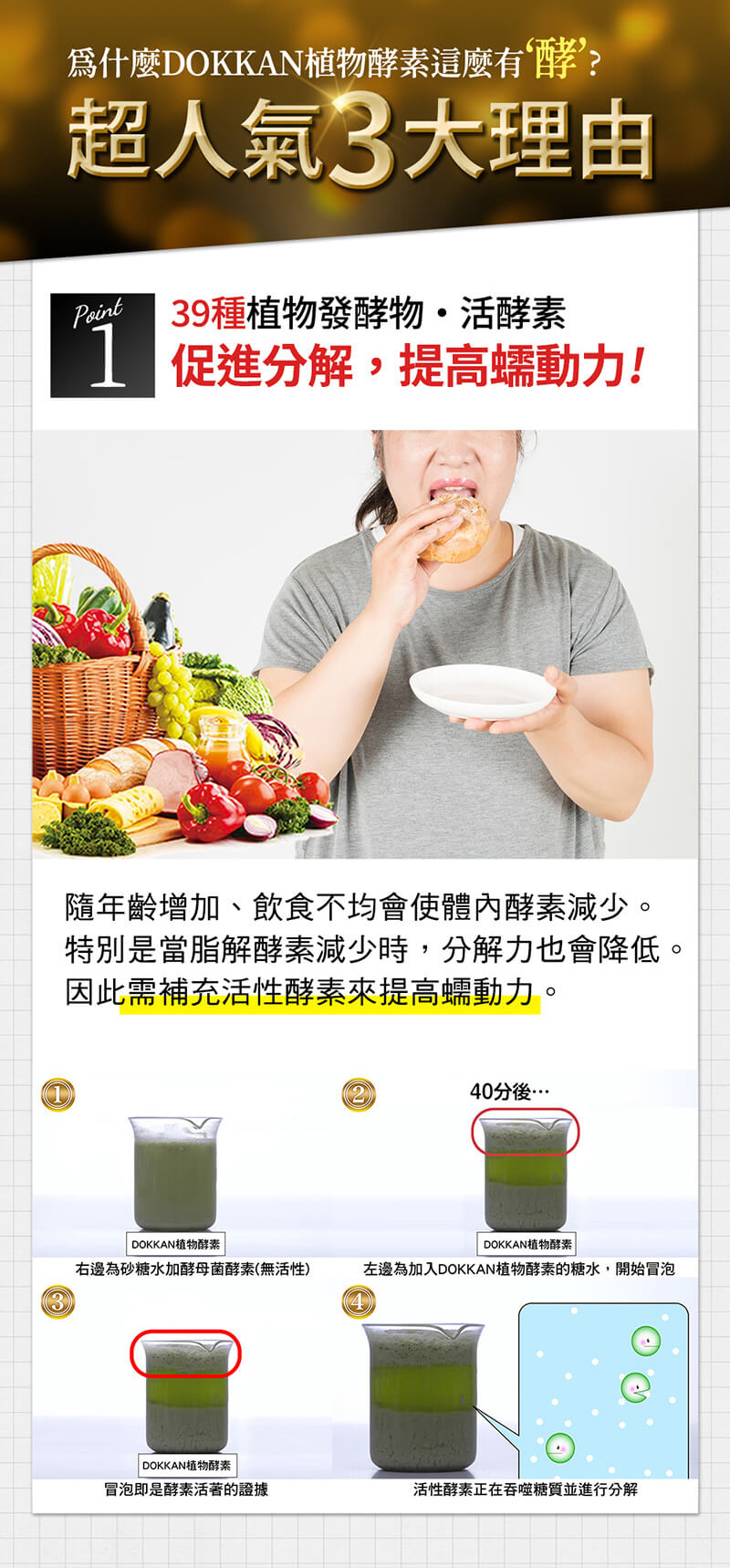 dokkan植物酵素金裝加強版是酵素保健食品銷售額的NO.1。累積販賣數突破3000000瓶,自2004年發行以來已有15年歷史,採用全天然配方,濃縮完美曲線所需的營養素,全方位幫助用戶獲得健康窈窕身材。dokkan植物酵素含有39種植物發酵物——活酵素,有效促進食物分解,提高腸道蠕動力。dokkan植物酵素金裝加強版還有14種舒眠草本纖維萃取維持代謝,使脂肪在夜間更能有效燃燒。dokkan植物酵素純天然無副作用,愛用者好評不斷,現在香港萬寧都有銷售。