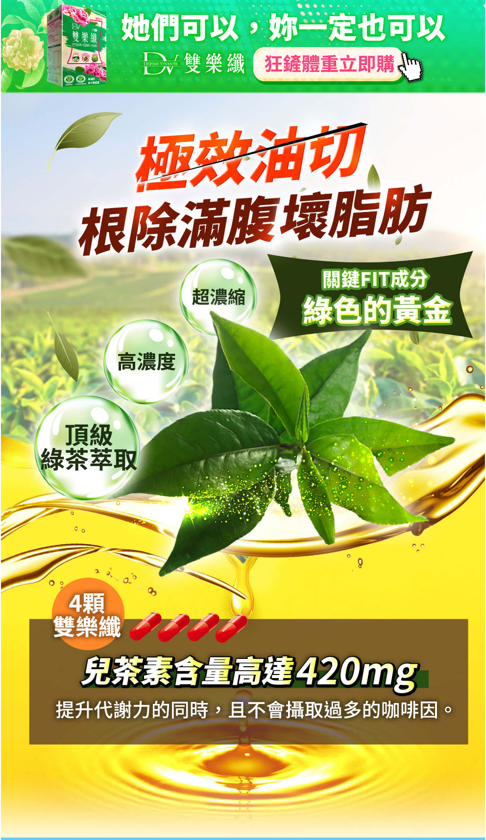 dv雙樂纖的關鍵 FIT成分,是從綠茶萃取的高濃度兒茶素,能極效油切。阻斷脂肪的吸收堆積。四顆雙樂纖的兒茶素含量高達420mg,連體內的壞脂肪都能分解掉。山苦瓜萃取含有高能清脂素,能減少 40-60%的熱量吸收並轉化脂肪,是所有節食幾口減肥者的福星。dv雙樂纖還添加山茶花種籽萃取,能有效降低體脂、血脂並幫助新陳代謝,讓你健康減肥不復胖。