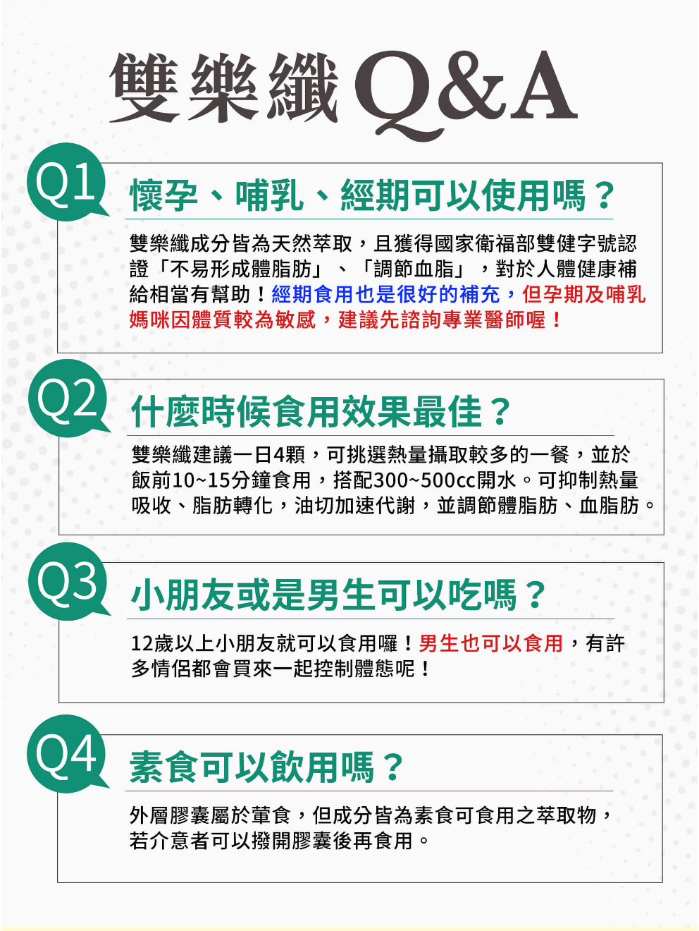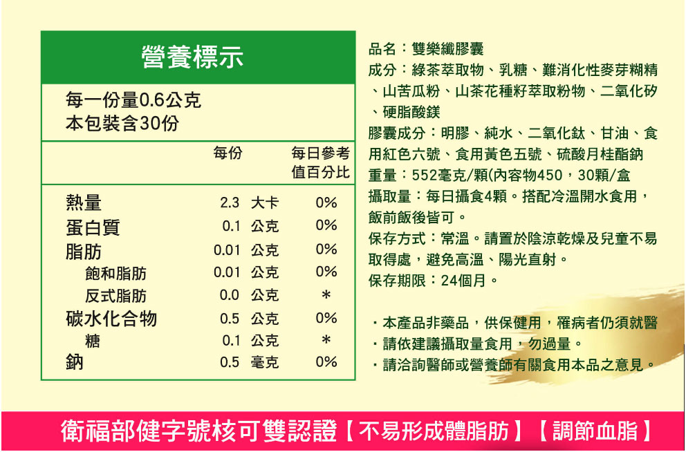雙樂纖成分皆為天然萃取,且獲得國家衛福部雙健字號詔證「不易形成體脂肪」、「調節血脂」 , 對於人體健康補給相當有幫助!經期食用也是很好的補充,但孕期及哺乳媽咪因體質較為敏感,建議先諮詢專業醫師喔!